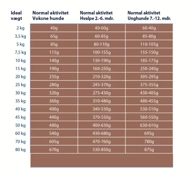 Bland foderet med varmt vand (60° C) eller hvalpemælk, lad foderet trække til den ønskede konsistens og foderet kan reguleres ved at ændre mængden af vand (grød). Foderet tilpasses de angivende tal i tabellen ud fra hundens normalvægt. På grund af de individuelle behov, kan tallene variere med +/-15%. Husk altid at hunden har adgang til frisk vand.