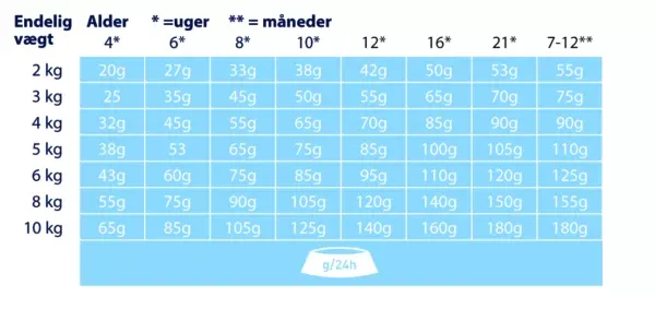 Bemærk: Giv foderet tør eller tilføj frisk, varmt vand (omkring 50-60° C) og lad det trække i et par minutter. Sørg for, at der er frisk drikkevand til rådighed på alle tidspunkter. Reducer mængden af foder, hvis du også giver din hund snacks/godbidder. I betragtning af forskellen mellem de enkelte hunde, kan den angivne daglige mængde reduceres med op til 15%, hvis hunden har tendens til at være overvægtig. Alderen er angivet i uger (uger) eller måneder (måneder). Mængden af foder er pr. dag og bør fordeles over flere måltider. De individuelle behov for hunde, kan ovennævnte være 15% lavere eller højere. Sikre at du ikke giver for meget foder – opmærksomhed på den moderate vækst. Omkring 9 til 12 måneders alderen, skiftes langsomt til et passende voksenfoder fra Happy Dog Fit & Vital Mini-serien..