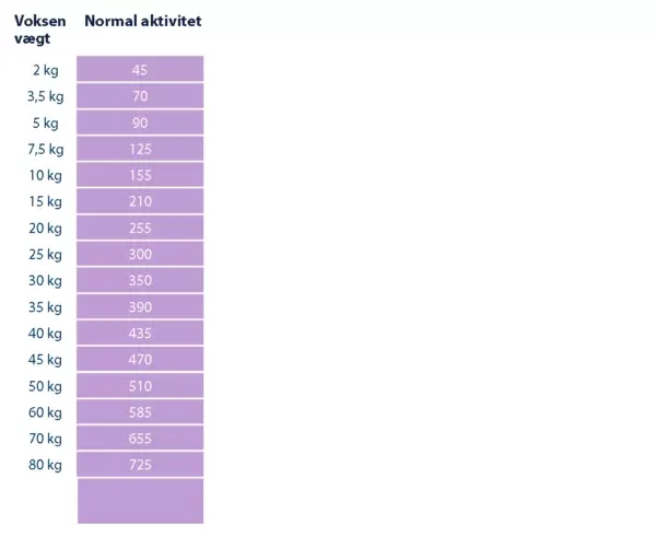 Giv foderet tør eller tilføj frisk, varmt vand (ved omkring 50-60° C) og lad det trække i et par minutter. Sørg for, at der er frisk drikkevand til rådighed på alle tidspunkter. Reducer mængden af foder, hvis du også giver din hund snacks/godbidder. I betragtning af forskellen mellem de enkelte hunde, kan den angivne daglige mængde reduceres med op til 15 %, hvis hunden har tendens til at være overvægtig.