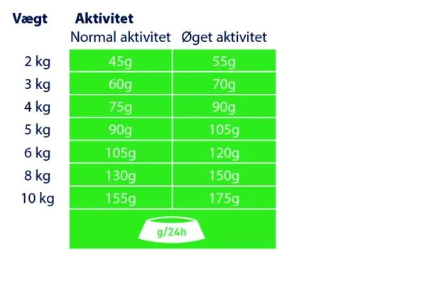 Giv foderet tør eller tilføj frisk, varmt vand (ved omkring 50-60° C) og lad det trække i et par minutter. Sørg for, at der er frisk drikkevand til rådighed på alle tidspunkter. Reducer mængden af foder, hvis du også giver din hund snacks/godbidder. I betragtning af forskellen mellem de enkelte hunde, kan den angivne daglige mængde reduceres med op til 15 %, hvis hunden har tendens til at være overvægtig.