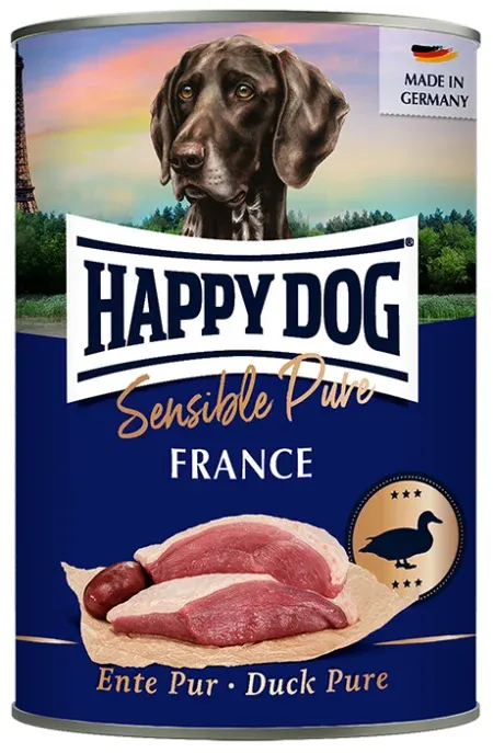 Ren nydelse af animalsk protein fra and – til ægte kødelskere. Fremstillet i Tyskland af 100% kød og animalske biprodukter fra and. Indeholder ingen kornprodukter og er fremstillet uden tilsat sukker. Anvendelsen af and som eneste kilde til animalsk protein, gør den særlig velegnet til fodring af sensible hunde. Sensible Pure France kan bruges som fuldfoder eller i kombination med Happy Dog flagefoderblanding eller Happy Dog tørfoder.