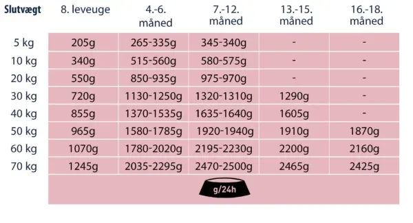 Bemærk: Mængden af ​​foder bør justeres gradvist, indtil den anbefalede fodermængde for følgende aldersgruppe er nået. Efterhånden som slutvægten er nået, falder energibehovet, og mængden af foder skal tilpasses efter foderanbefalingerne. Vej hvalpene regelmæssigt og dokumenter deres vægtudvikling. Det kan være nødvendigt at justere mængden af foder individuelt. Fodre ikke for meget – vær opmærksom på den moderate vækst. Ved tilsætning af snacks bør fodermængden reduceres tilsvarende. Fordel den daglige foderration på flere måltider (3-4).Fodres ved stuetemperatur. Sørg for, at der altid er frisk drikkevand til rådighed.