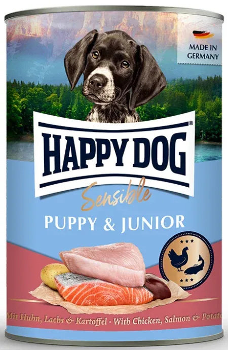 Vådfoder til hvalpe- og unghunde fra 8. leveuge. Ren nydelse af animalsk protein fra kylling og laks – til ægte kødelskere. Vådfoder kombinerer velsmagende kylling med næringsrig laks og letfor-døjelige kartofler. Opskriften er glutenfri og uden tilsat sukker. Med over 90% animalsk protein i det samlede proteinindhold er dette højkvalitets vådfoder velegnet til hunde fra 8. leveuge. Sensible Puppy & Junior Vådfoder kan bruges som eneste ernæring eller i kombination med Happy Dog tørfoder. Her er Happy Dog Supreme Sensible Puppy Kylling, Laks & Kartoffel eller Happy Dog Supreme Sensible Junior Kylling, Laks & Kartoffel ideelle valg.