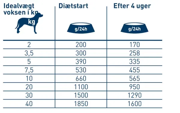Den optimale vægttab på 1-3% af den aktuelle kropsvægt pr. uge skal kontrolleres regelmæssigt. Det øgede afføring skyldes det højere indhold af kostfibre. For at undgå fordøjelsesproblemer anbefales en langsom overgang til foder over flere dage.