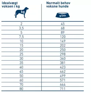 Mængden af foder skal tilpasses hundens individuelle stofskifte og skal muligvis justeres i moderate mængder. Hunden skal altid have frisk vand til rådighed.