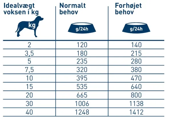 Mængden af foder skal tilpasses hundens individuelle stofskifte og skal muligvis justeres i moderate mængder. Hunden skal altid have frisk vand til rådighed.