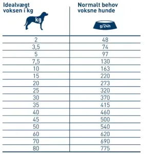 Mængden af foder skal tilpasses hundens individuelle stofskifte og skal muligvis justeres i moderate mængder. Hunden skal altid have frisk vand til rådighed.